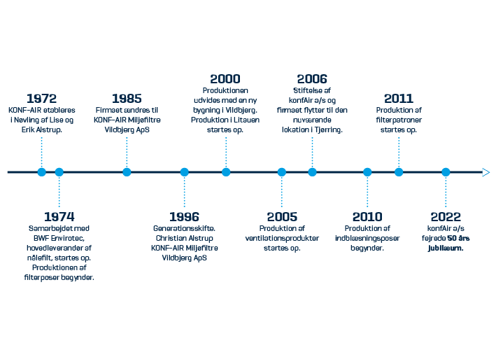 Det hele startede beskedent i 1972, da Lise og Erik Alstrup etablerede virksomheden under navnet ”KONF-AIR”. De første lokaler var indrettet i hjemmets staldbygninger ved Nøvling, hvor fliden og det gode håndværk dannede fundamentet. De første to år gik med at fremstille trykluftsstablere til tekstilindustrien, men i 1974 tog historien en ny drejning. Her indledte vi et tæt samarbejde med den tyske nålefiltsproducent BWF, hvilket markerede starten på vores produktion af filterposer – en specialisering, vi har udviklet lige siden.