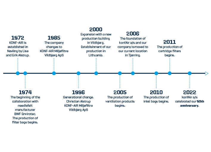 It all started humbly in 1972, when Lise and Erik Alstrup founded the company under the name “KONF-AIR”. The first premises were set up in farm outbuildings at the family home in Nøvling, where diligence and craftsmanship laid the foundation. The first two years were spent manufacturing compressed-air stackers for the textile industry, but in 1974 the story took a new turn. We began a close collaboration with the German needle-felt manufacturer BWF, which marked the start of our production of filter bags – a specialization we have continued to develop ever since.